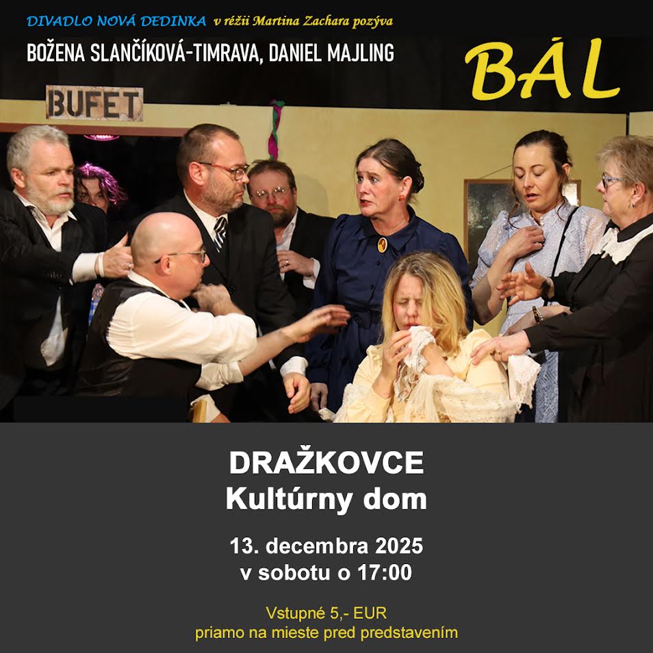 Srdečne Vás pozývame v sobotu 13.decembra 2025 o 17:00 na divadelné predstavenie Bál (Božena Slančíková - Timrava, Daniel Majling), ktoré nám príde zahrať divadelný súbor z Novej Dedinky